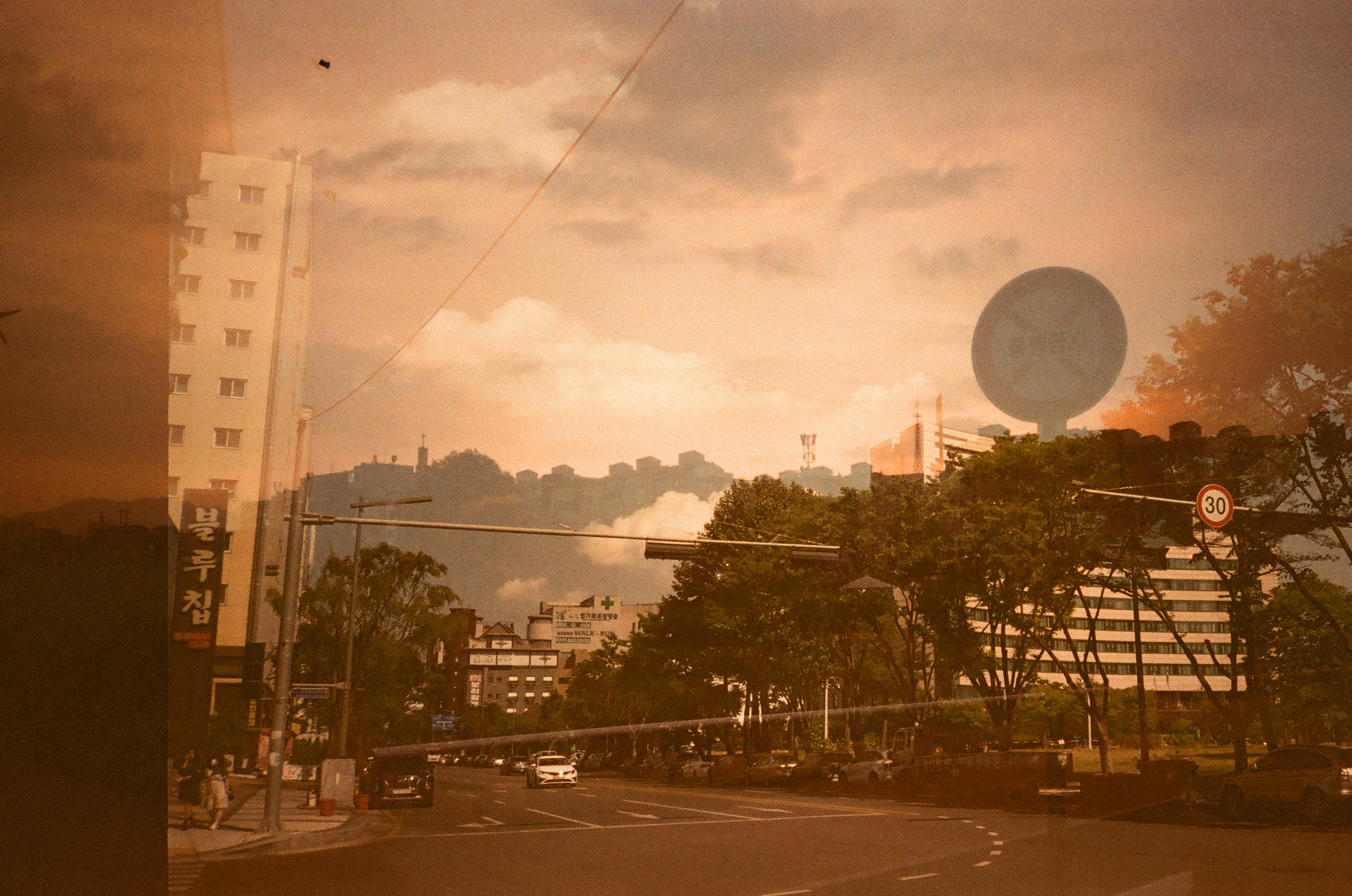 아마도 갑천의 아파트와 봉명동 내 집앞의 풍경 이중노출, 아파트 산과 나무가 절묘하게 맞아 재밌다.